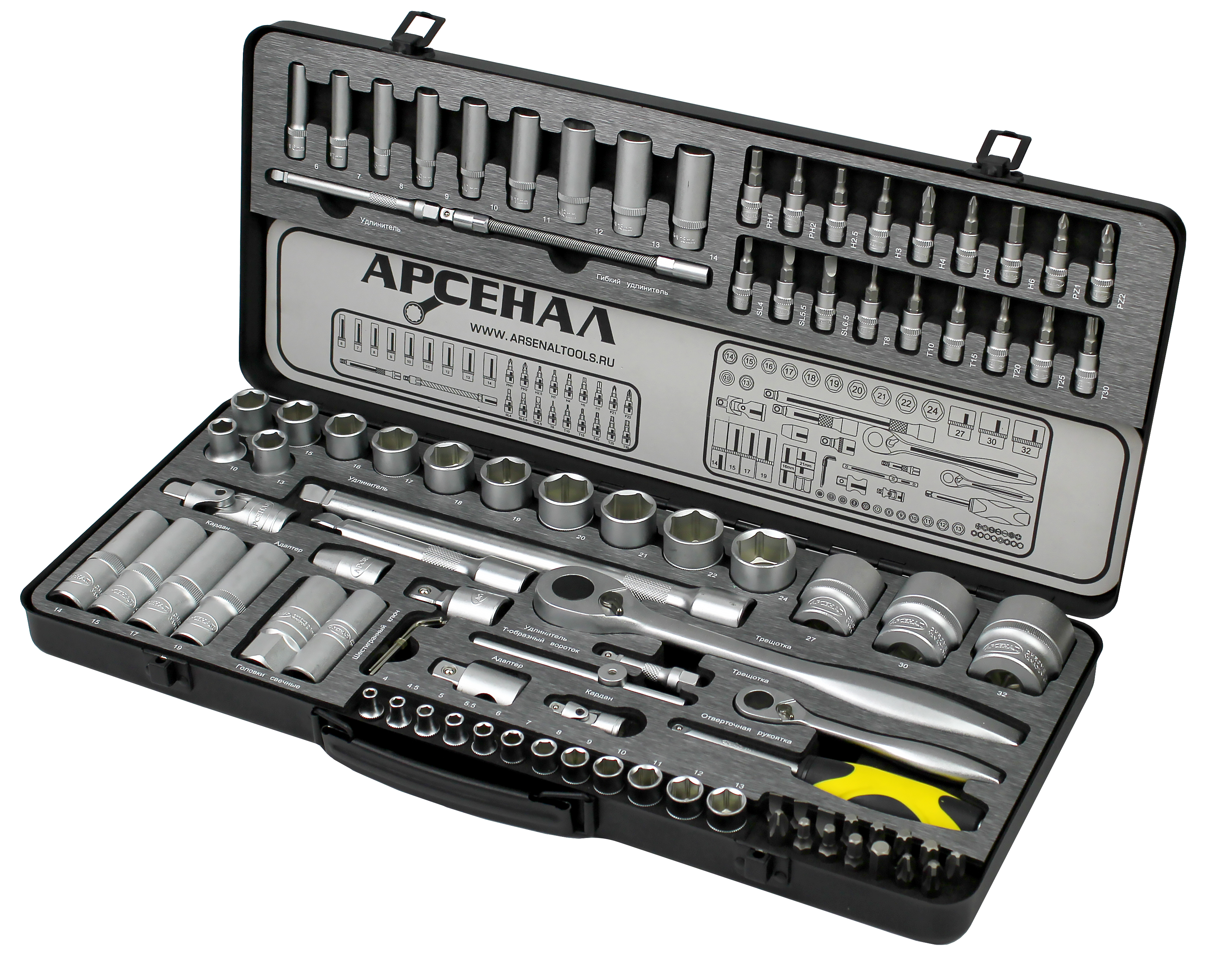 Сталь, из которой изготовлен инструмент, легирована хромом и ванадием с нанесением никелевого покрытия. Особо прочный кейс из толстой листовой стали с тройным контуром штамповки. Ламинированные грязе- и маслостойкие ложементы. Наборы инструментов Арсенал имеют пожизненную гарантию. Арсенал - всегда качественный инструмент и надежные кейсы.